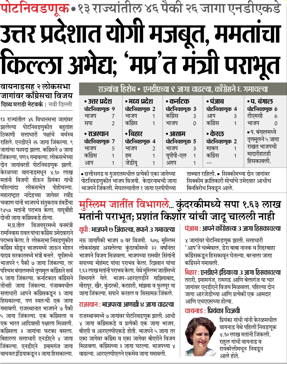 १३ राज्यांतील ४६ विधानसभा जागांवर झालेल्या पोटनिवडणुकीत बहुतांश ठिकाणी सत्ताधारी पक्षांचे वर्चस्व राहिले. एनडीएने २६ जागा जिंकल्या. ९ जागांचा फायदा झाला. काँग्रेसने ७ जागा जिंकल्या, पण ६ गमावल्या. लोकसभेच्या दोन जागांवरही पोटनिवडणूक झाली. केरळच्या वायनाडमधून ४.१० लाख मतांनी विजयी होऊन प्रियंका गांधी पहिल्यांदा लोकसभेत पोहोचल्या. महाराष्ट्रात नांदेडच्या जागेवर रवींद्र चव्हाण यांनी भाजपचे संतुकराव हंबर्डेंचा १४५७ मतांनी पराभव केला. यापूर्वीही दोन्ही जागा काँग्रेसकडे होत्या.